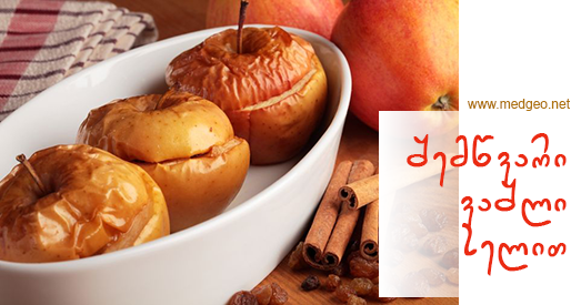 4 ცალი საშუალო ზომის ვაშლი კანიანად დავჭრათ და გავასუფთაოთ. მოვაყაროთ ქიშმიში, შვრია და სელის მარცვლები, ვანილი და დარიჩინი.